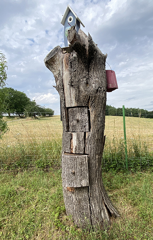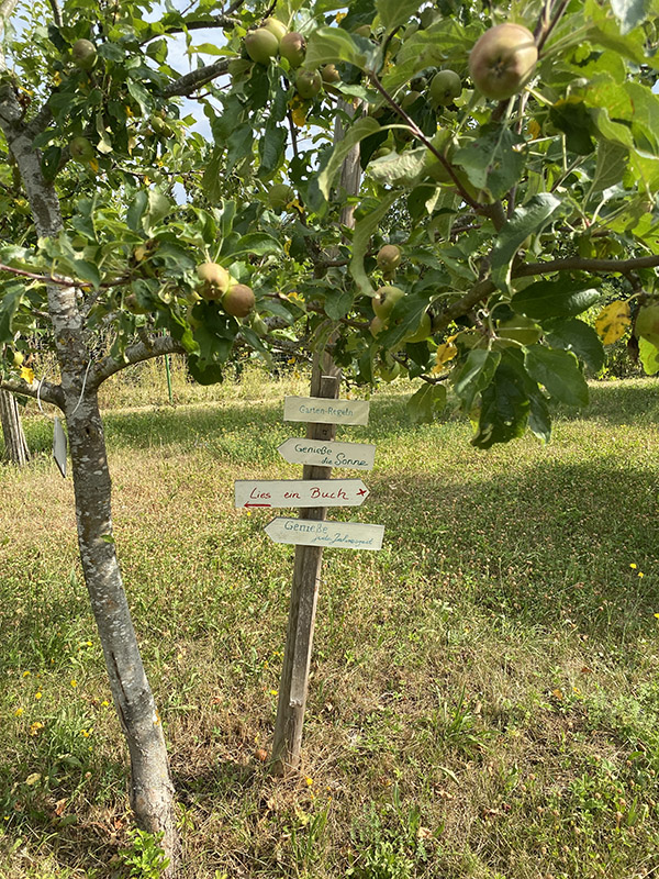 Ein Highlight der Etappe war, ein liebevoll gepflegter Schauobstgarten: Sitzplätze, Wasserstelle, Bücherbaum, Bienenstöcke – und sogar Übernachtungsmöglichkeiten im Schäferwagen oder Tiny House. Danach ging es über die Hochebene mit weiten Ausblicken, später wieder durch Wald.
