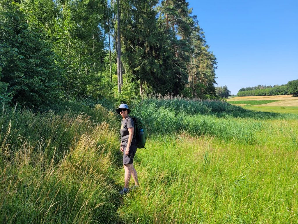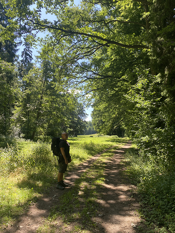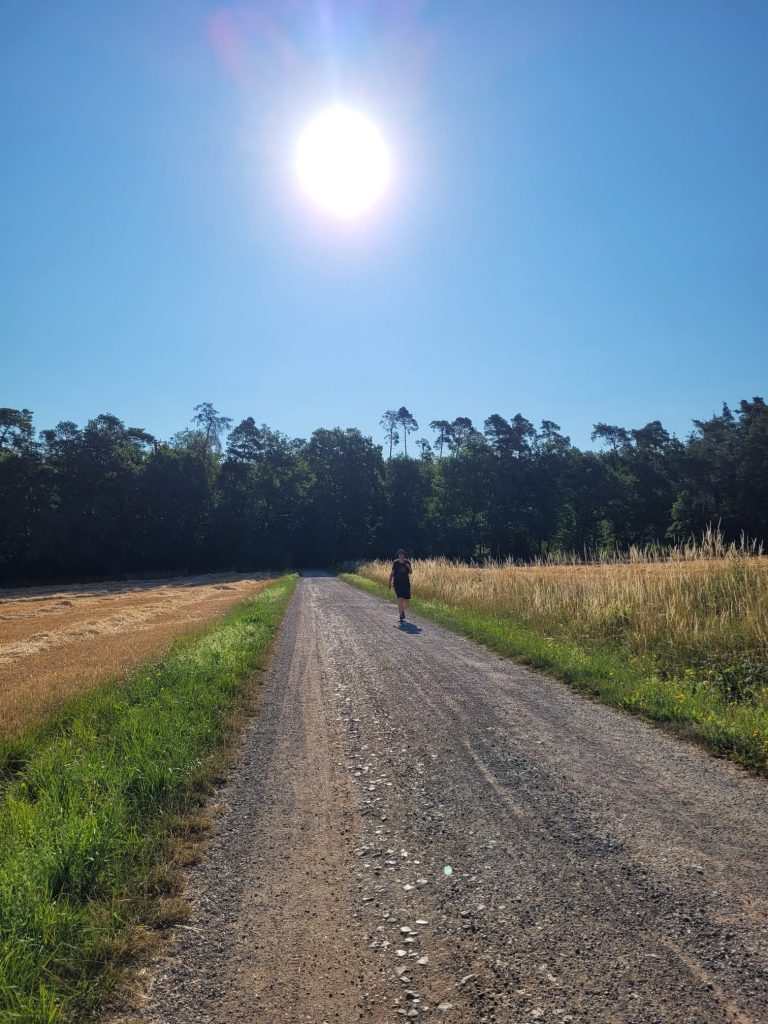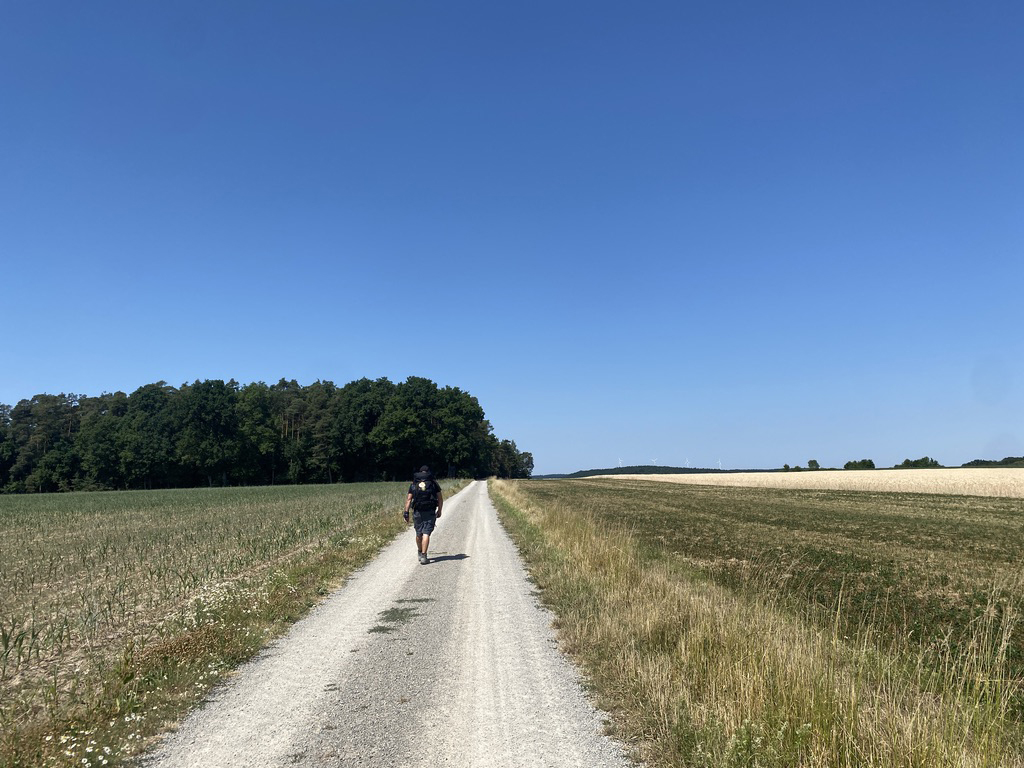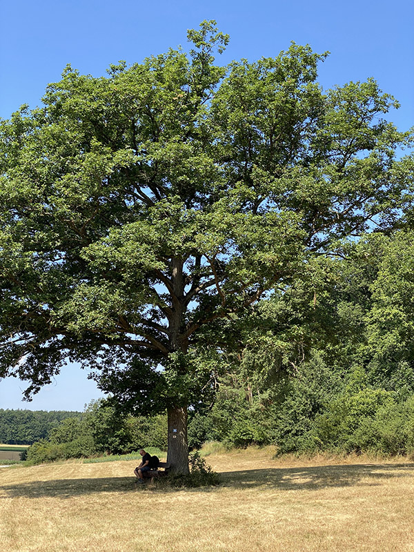 Der letzte Tag begann heiß – und blieb es. Die Strecke bot noch einmal schöne, offene Landschaft, Felder und (wenige) schattige Waldstücke. Besonders beeindruckend war eine uralte Eiche am Weg.
