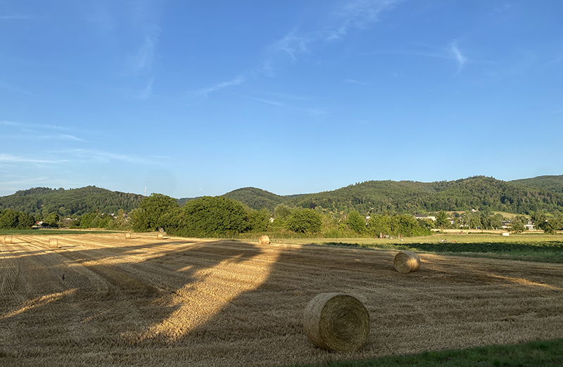Dann ging es mit der Regionalbahn nach Hause. Bahnchaos verlängerte meine sonst dreistündige Fahrt auf fünf Stunden. Vom Nachbarort musste ich schließlich auch noch zu Fuß heimlaufen – aber darauf kam es jetzt auch nicht mehr an. Mein Blick schweifte über die abgemähten Felder und hin zu den Hügeln der Bergstraße. Ja, zuhause ist es auch schön.