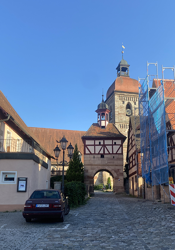 Um 17:00 Uhr sind wir an diesem heißen Tag erschöpft in Roßtal angekommen. Nach einer kurzen Rast auf meinem Zimmer und einem Abendessen im Restaurant der Pension erkunde ich noch ein wenig den Ort mit seinen idyllischen Gassen und dem schönen Marktplatz.