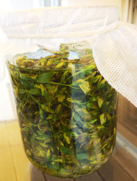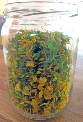 Rezept Johanniskrautöl Ein sauberes Glas wird locker mit Blüten, Knospen und auch ein paar grünen Blättern gefüllt. Dann übergießt man es mit einem guten Olivenöl. Dann das Glas, mit einem Mulltuch oder einem Küchenpapier bedeckt (damit die Feuchtigkeit entweichen kann), eine Woche lang der Sonne aussetzen. Danach kann das Glas mit dem Deckel verschlossen werden und wird weitere fünf Wochen der Sonne ausgesetzt. Meist hat das Öl schon nach der ersten Woche eine schöne rote Farbe angenommen. Das Öl wird dann durch einen Teefilter oder ein Stoffsieb abgegossen und in dunkle Fläschchen gefüllt. Kühl aufbewahrt ist es ungefähr ein Jahr lang haltbar.